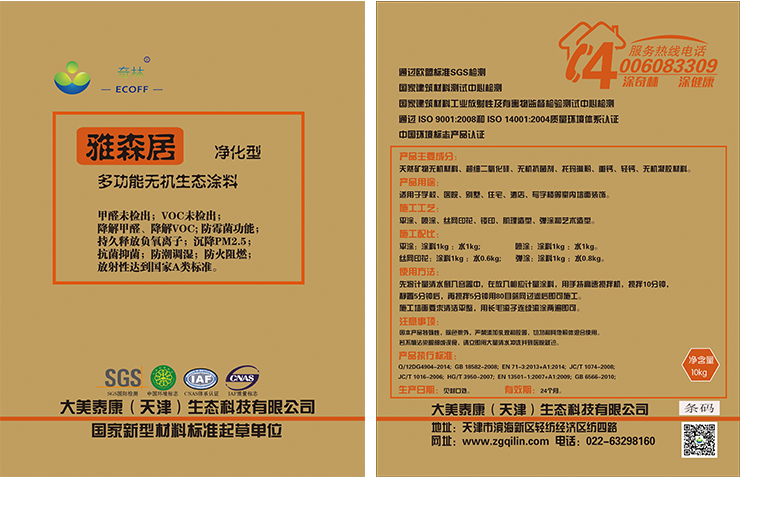 雅森居-凈化型:無機多功能生態涂料1.甲醛未檢出;VOC未檢出;2.抗菌抑菌;防霉菌功能;3.防潮調濕;消除室內異味;4.防火阻燃;5.放射性達到A類標準;6.持久釋放負氧離子;沉降PM2.5;7.降解甲醛、降解VOC。凈含量:10kg工藝性能:平涂、噴涂、彈涂、輥涂,各種肌理造型,絲網印樓印技術;有千余種顏色搭配,并且涂刷效果可以多彩多圖個性定制,美觀大方,采用無機色漿,顏色色澤持久穩定。